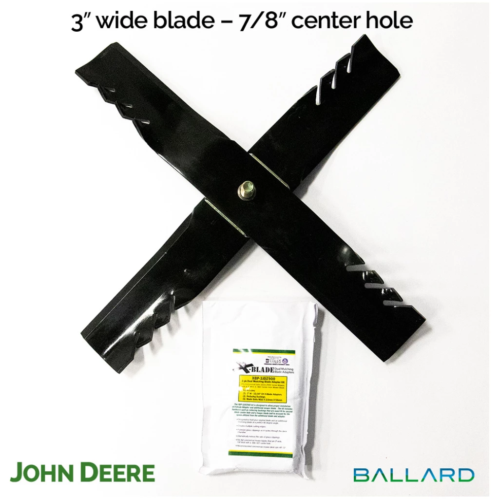 PLEASE NOTE: This X-Blade Dual Mulching Blade Adapters fit all 700, 800 & 900 Series John Deere commercial mower blades that are 2 ½″ wide and have a 7/8″ center hole. Comes with the (3) adapters, (3) bolts and (3) center spacers required to set up your mower correctly.