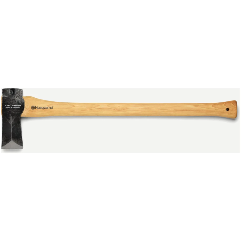 30” wood splitting axe is suited for splitting of thicker firewood. The head is designed to cut easily into wood with minimal effort, splitting wood in two parts. The long handle delivers extra power and a two-handed grip. Comes with an edge cover in leather. Made of hickory and hand-forged Swedish steel. The head is attached to the handle using both a wooden and a steel wedge to secure fastening.
